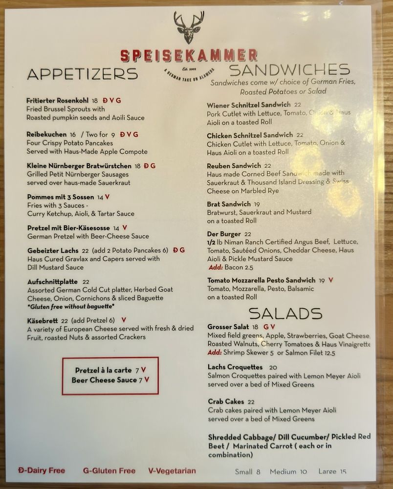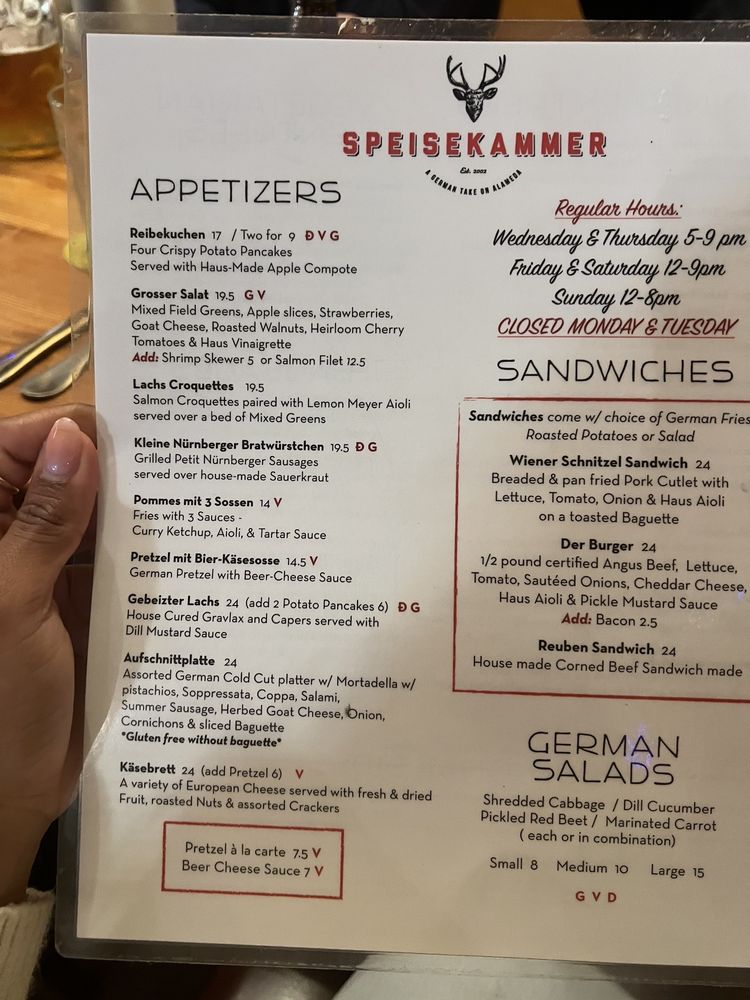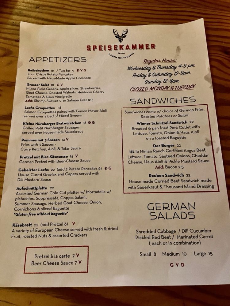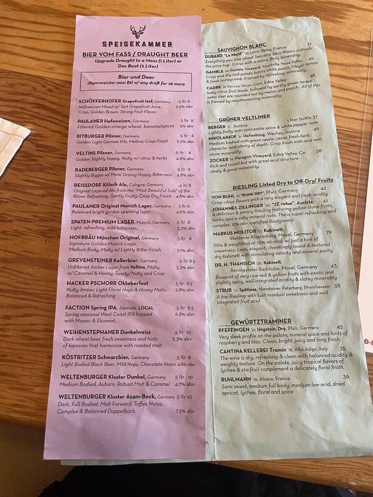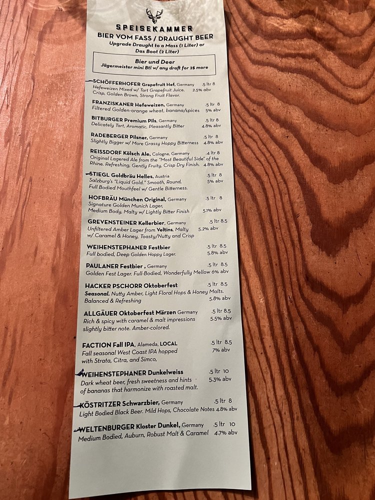 Welcome to Speisekammer, a German restaurant located in Alameda, CA. This quaint eatery offers a variety of traditional German dishes, including Kleine Nurnberger Bratwurstchen, potato pancakes, and schnitzel with spaetzle. The menu boasts Pescatarian options, vegan options, and limited vegetarian choices, catering to a wide range of dietary preferences. With a full bar, outdoor seating, and live music on Fridays, Saturdays, and Sundays, Speisekammer provides a vibrant and welcoming atmosphere for guests to enjoy. Customers praise the generous portions, friendly service, and delicious German beers. Make sure to try the crispy potato pancakes and the grilled meat platter for a true taste of German cuisine. Come experience the charm and flavors of Speisekammer for yourself!
