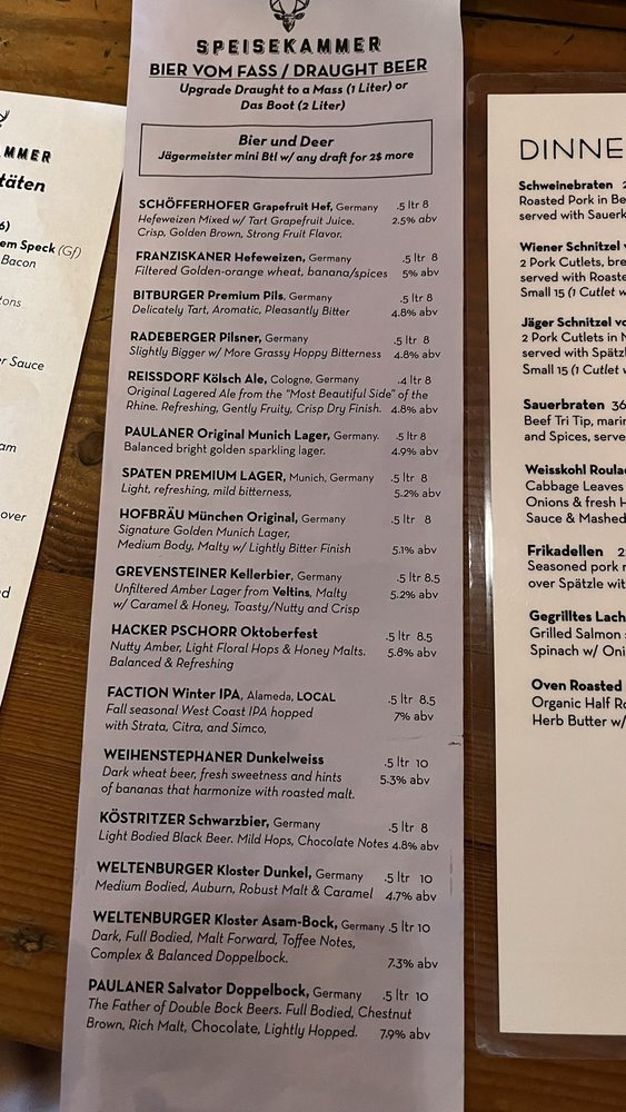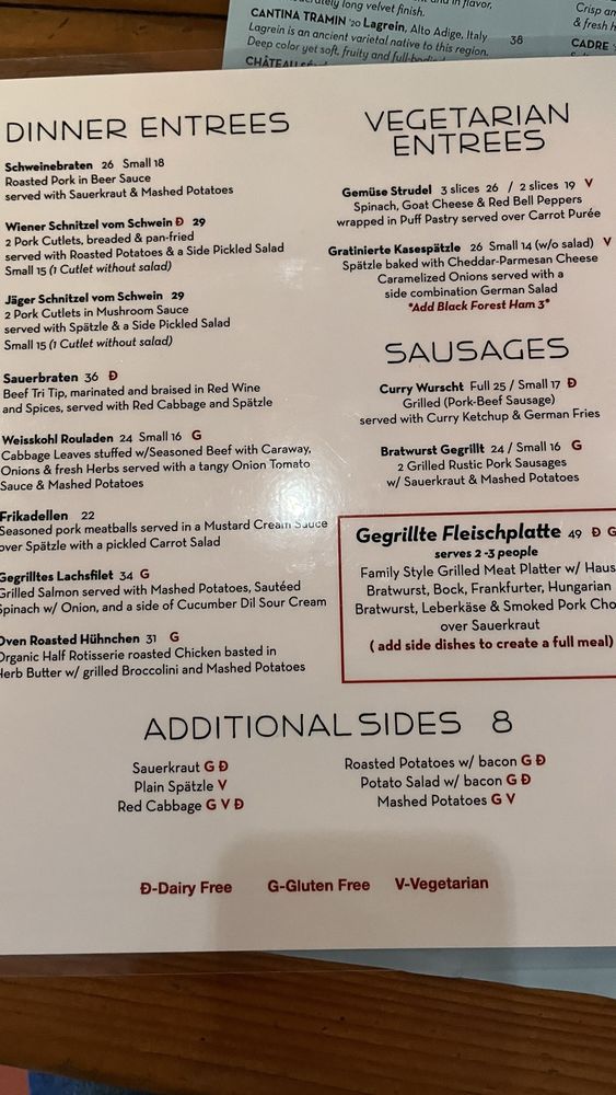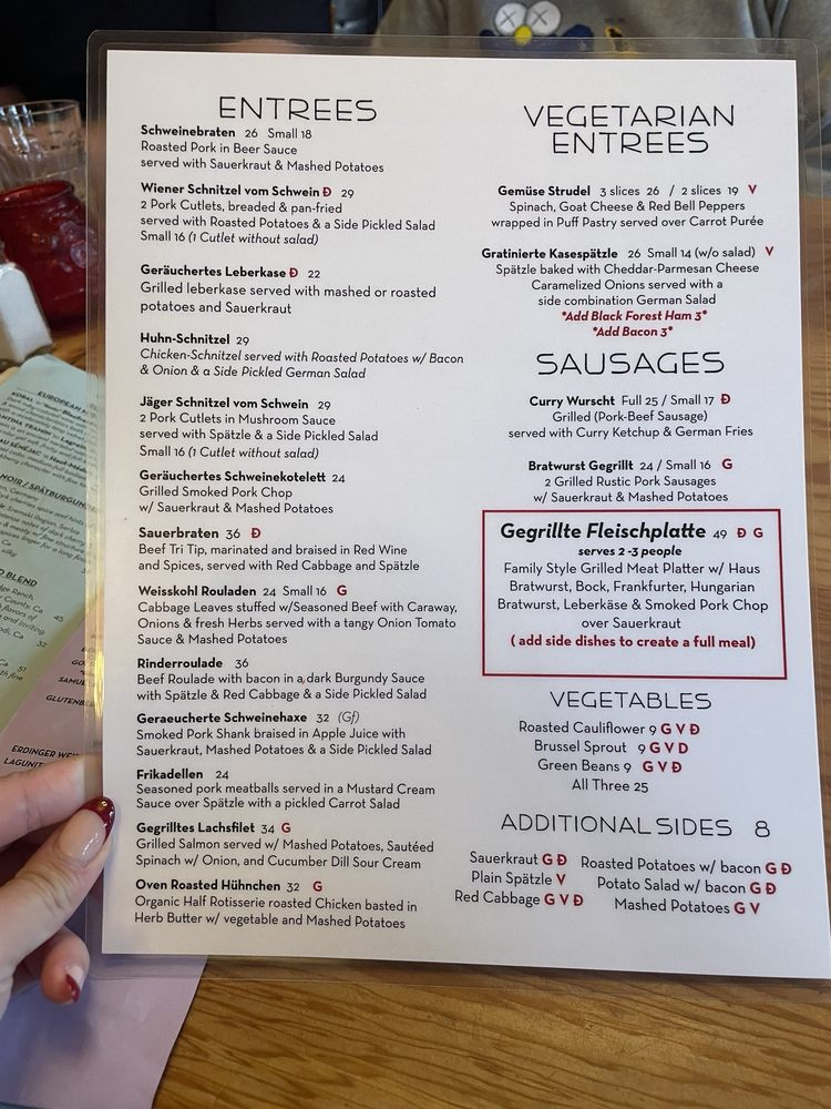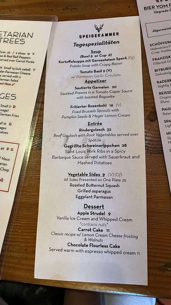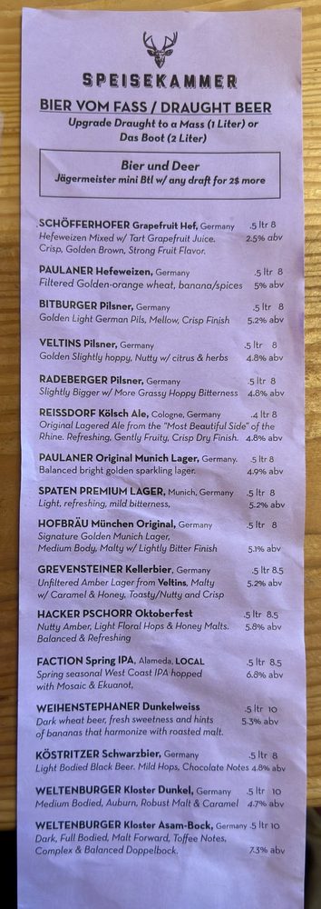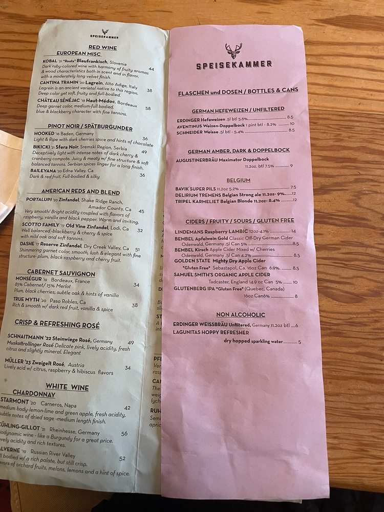 Welcome to Speisekammer, a German restaurant located in Alameda, CA. This quaint eatery offers a variety of traditional German dishes, including Kleine Nurnberger Bratwurstchen, potato pancakes, and schnitzel with spaetzle. The menu boasts Pescatarian options, vegan options, and limited vegetarian choices, catering to a wide range of dietary preferences. With a full bar, outdoor seating, and live music on Fridays, Saturdays, and Sundays, Speisekammer provides a vibrant and welcoming atmosphere for guests to enjoy. Customers praise the generous portions, friendly service, and delicious German beers. Make sure to try the crispy potato pancakes and the grilled meat platter for a true taste of German cuisine. Come experience the charm and flavors of Speisekammer for yourself!